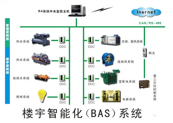 楼宇智能化(BAS)系统负责完成大厦中空调制冷系统、变配电系统、照明系统、供热系统及电梯等的计算机监控管理。